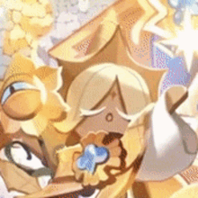 | Pure Vanilla Cookie wears traditional garb of the Vanilla Kingdom, shown through his waffle cone hat, vest, and white robe. He has heterochromia - one blue eye, one yellow eye - and there is a star shape in darker dough upon his forehead. He has gentle yellow hair and carries a staff. |